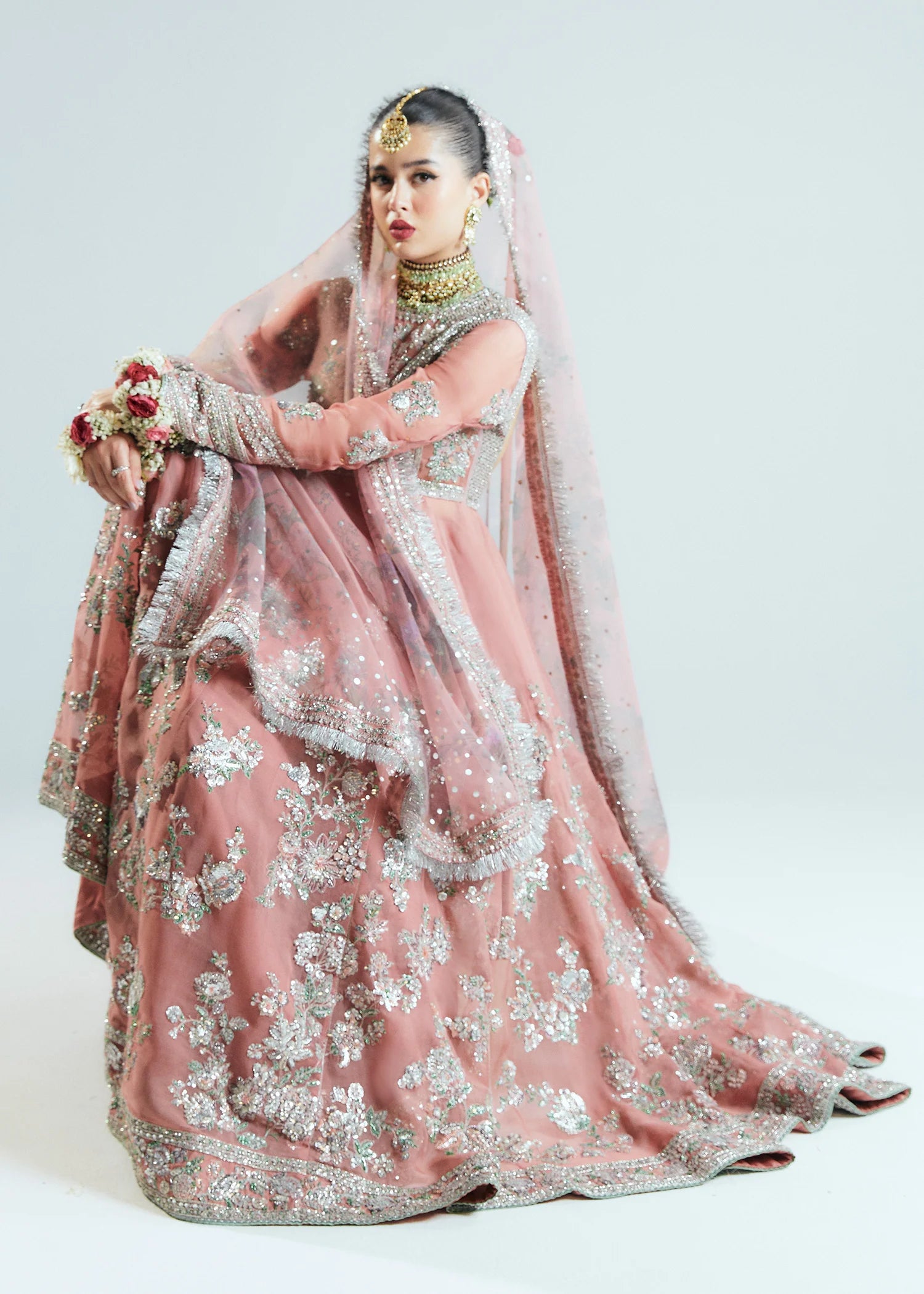 A Classic Coral organza Peshwas intricately embellished with silver dabka, naqshi and sequins. Further it is paired with korean rawsilk sharara with heavy embellished border completing the over all look with digital printed dupatta enhanced with foil print and heavy embellished border. Detailed embellishment on the entire outfit makes it a perfect fit for any formal occasion.