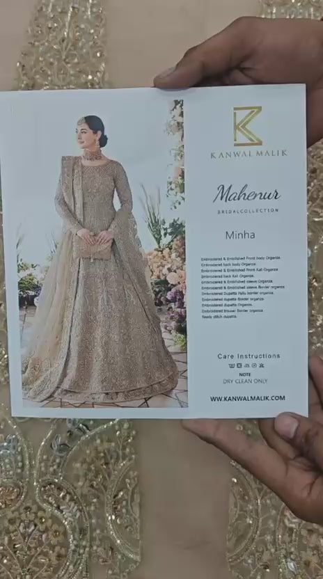 “Minha” is all about delicacy personified on a nude colored organza pishwas, which exhibits heavenly embellished geometric and floral patterns, adorned with rich, magnificent details. Paired with a self jamavar lehanga, with fully embellished exquisite border along with delicately paired with organza dupatta with four sided embellished border and extended pallu and booti spray. Moreover, a beautiful light champagne luxe net veil with pearls spray and four-sided intricate border has been added to give a goddess look to the outfit..